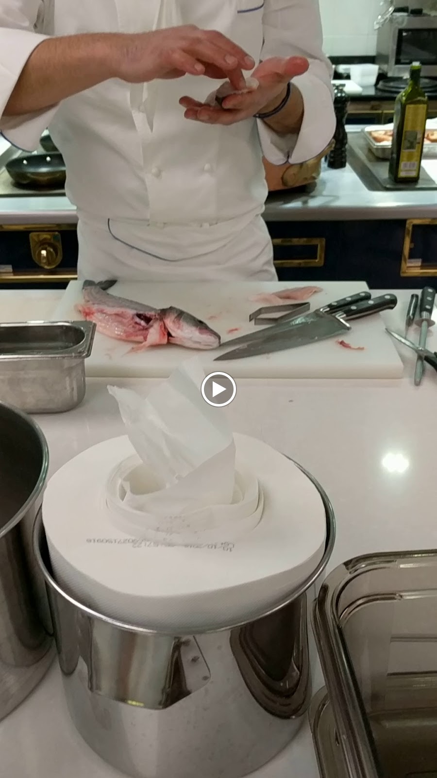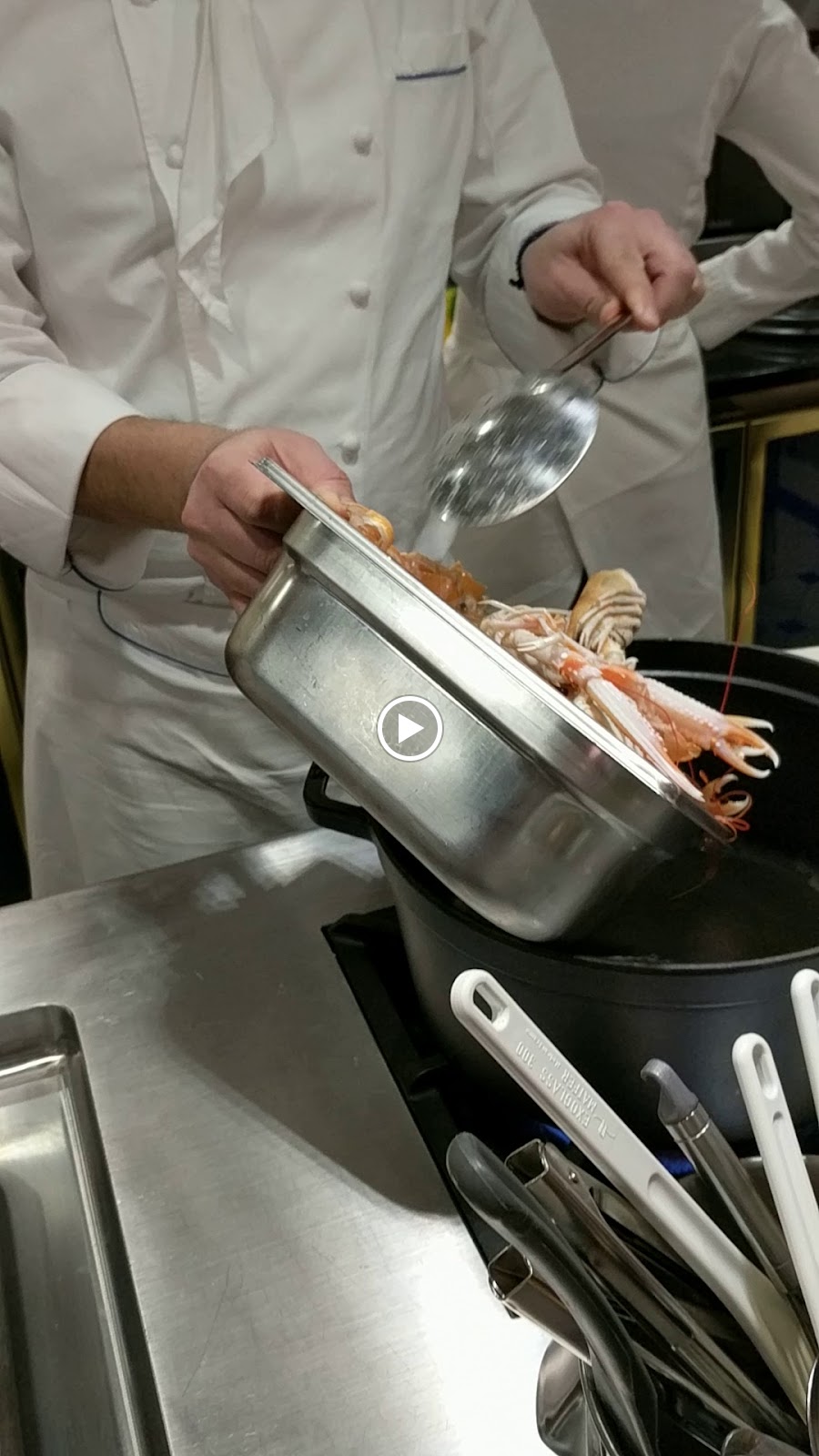 Chef Simon Manoukian and his assistant Muna greeted us and we were welcomed to the Ritz Ecole Escoffier. Simon has been with the Ritz for 7 years and was recently asked to be the instructor for the Ecole. There were three of us including my wife, the other lady Patricia was from Normandy and had been given this as 1 of her 12 monthly gifts for her 60th birthday. Our class was to to prepare and make a 3 course meal focusing on seafood. The kitchen was large and set up to give hands on instruction to groups. Since we were only 3 we all had an opportunity to partake in all the preparation. Our main ingredients today were Sea Bass and Langoustine, we were making a Starter of Langoustine Raviolis with a Seafood Sauce and Sea Bass with Chorizo Beurre Blanc Sauce and Mashed Potatoes. Keep in mind we are starting from scratch so this is going to be quite an adventure.