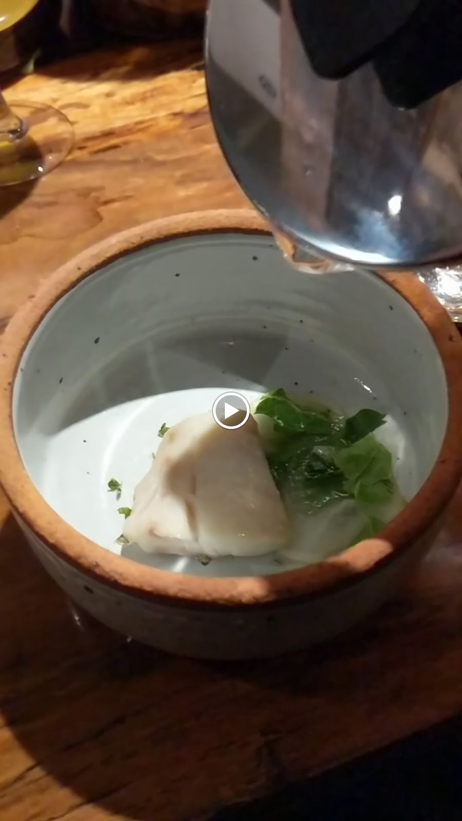 a steaming Miso tea. Not only is this a beautiful creation it is also what I would call performance cooking, where you take several components together and add another while table side to make an completely new dish. This is a 2 part dish where you first eat the fish then swirl the Miso tea and drink it. Very satisfying!